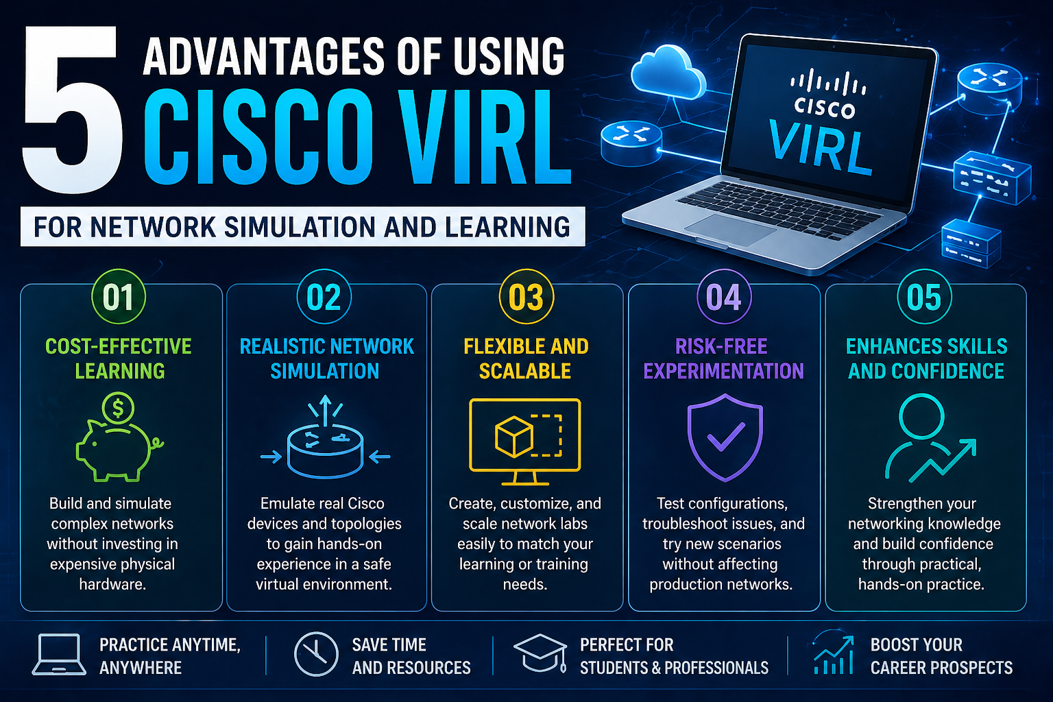 Cisco VIRL encourages continuous skill development by allowing users to practice regularly without limitations. Since environments can be created and reset easily, users can keep refining their skills over time.