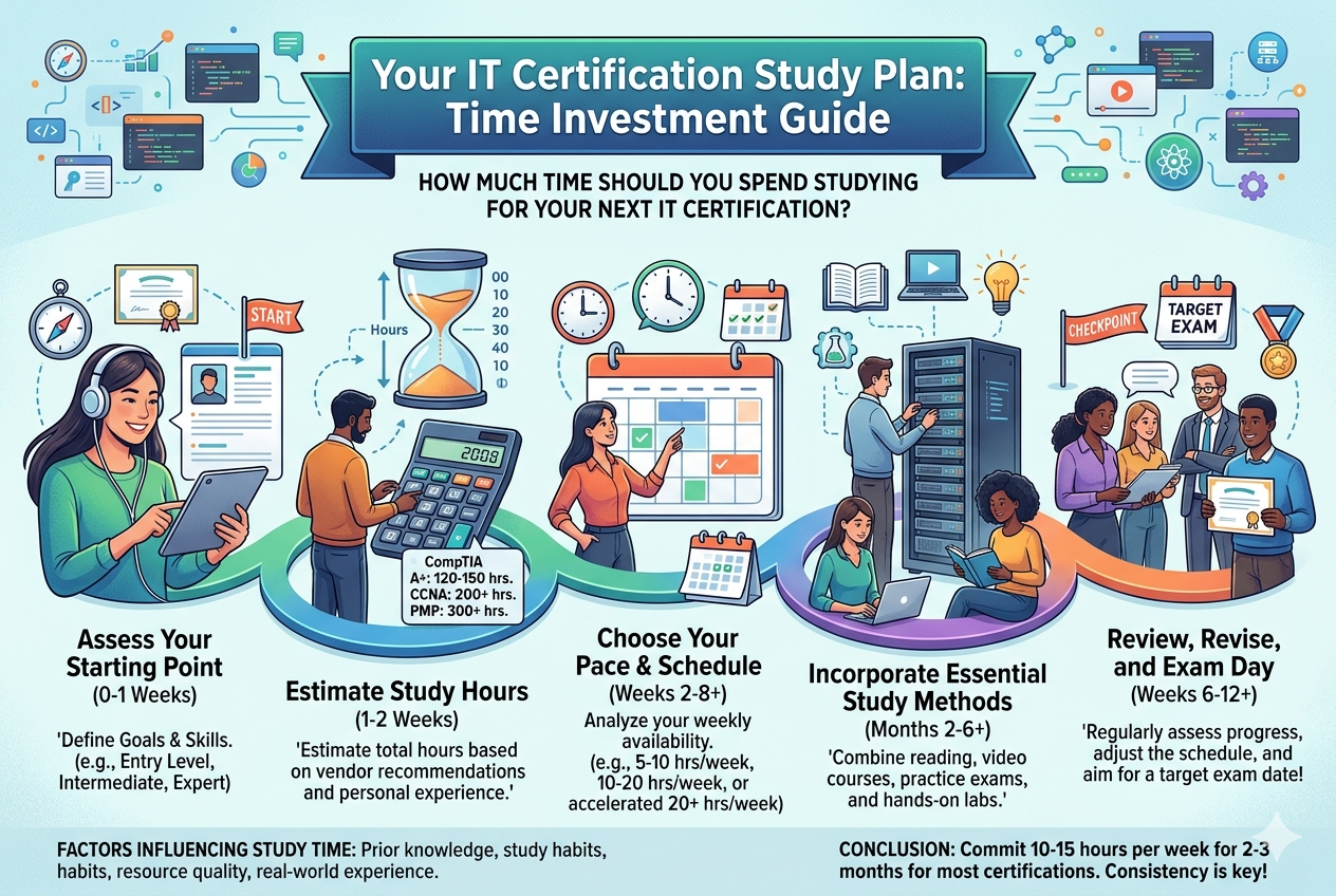 The time you should spend studying for an IT certification is not a fixed number but a balance between your current knowledge, consistency, and study quality. What matters most is not how many hours you put in, but how effectively you use those hours to understand concepts, practice skills, and reinforce learning over time. Beginners usually need a longer preparation period with steady daily effort, while experienced learners can focus more on revision, practice tests, and filling specific knowledge gaps.