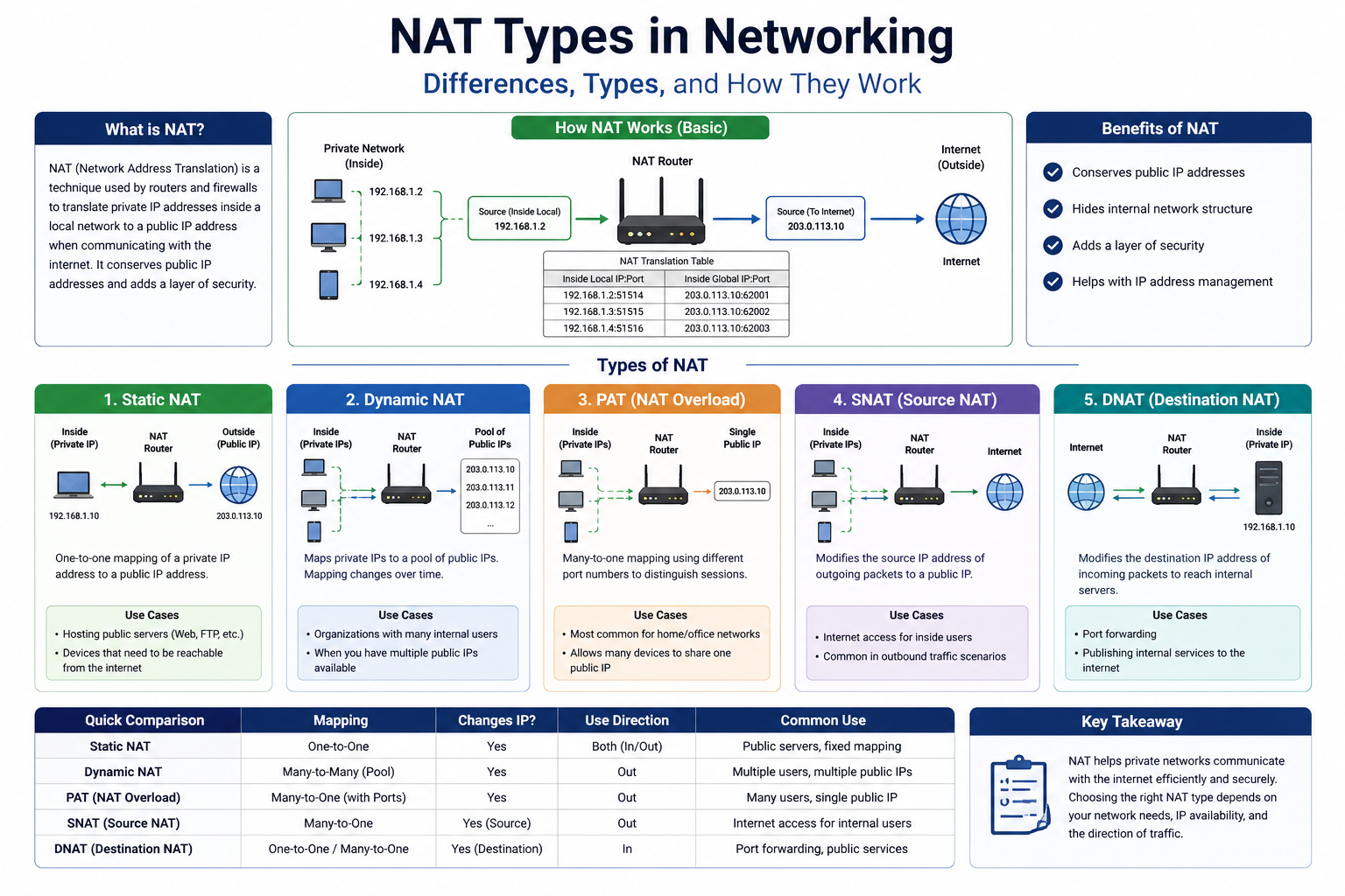 NAT remains one of the most important foundational technologies in modern networking. It enables efficient use of limited IPv4 addresses, supports large-scale connectivity, and provides a basic level of network isolation. Across different implementations such as static NAT, dynamic NAT, and PAT, it adapts to various operational needs ranging from simple home networks to complex enterprise infrastructures.