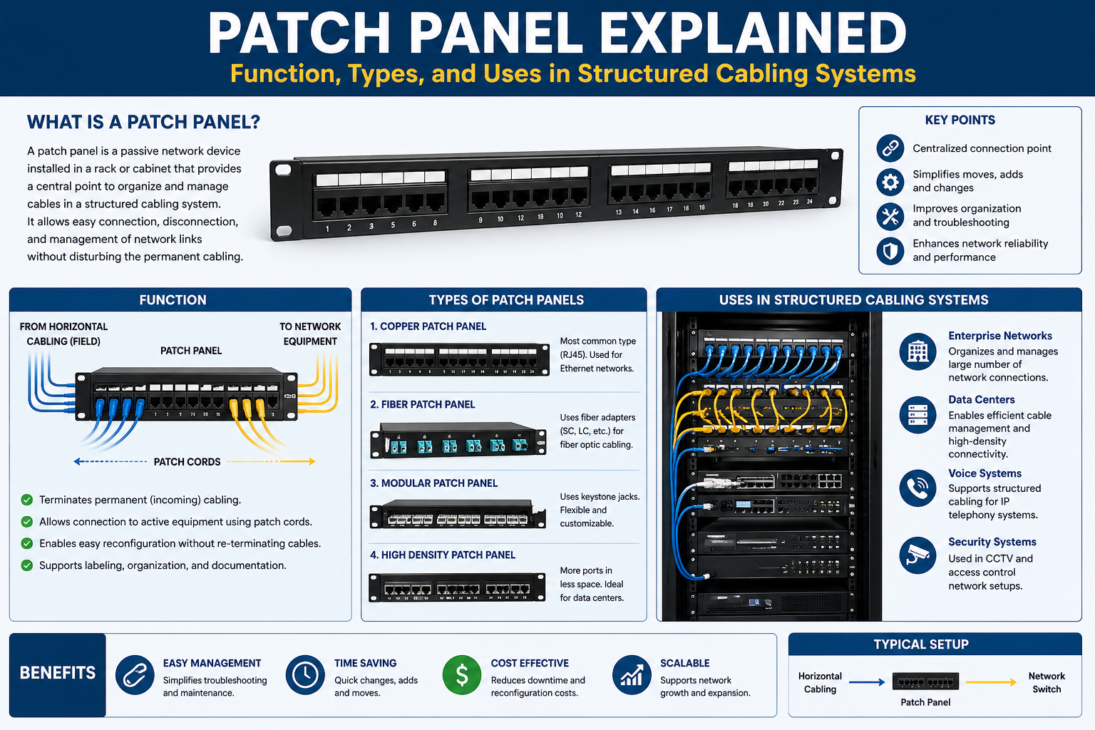 Even with a limited number of devices, direct cabling can quickly become messy and difficult to manage. A patch panel solves this by centralizing all connections in one location, making it easier to understand and control the network layout.