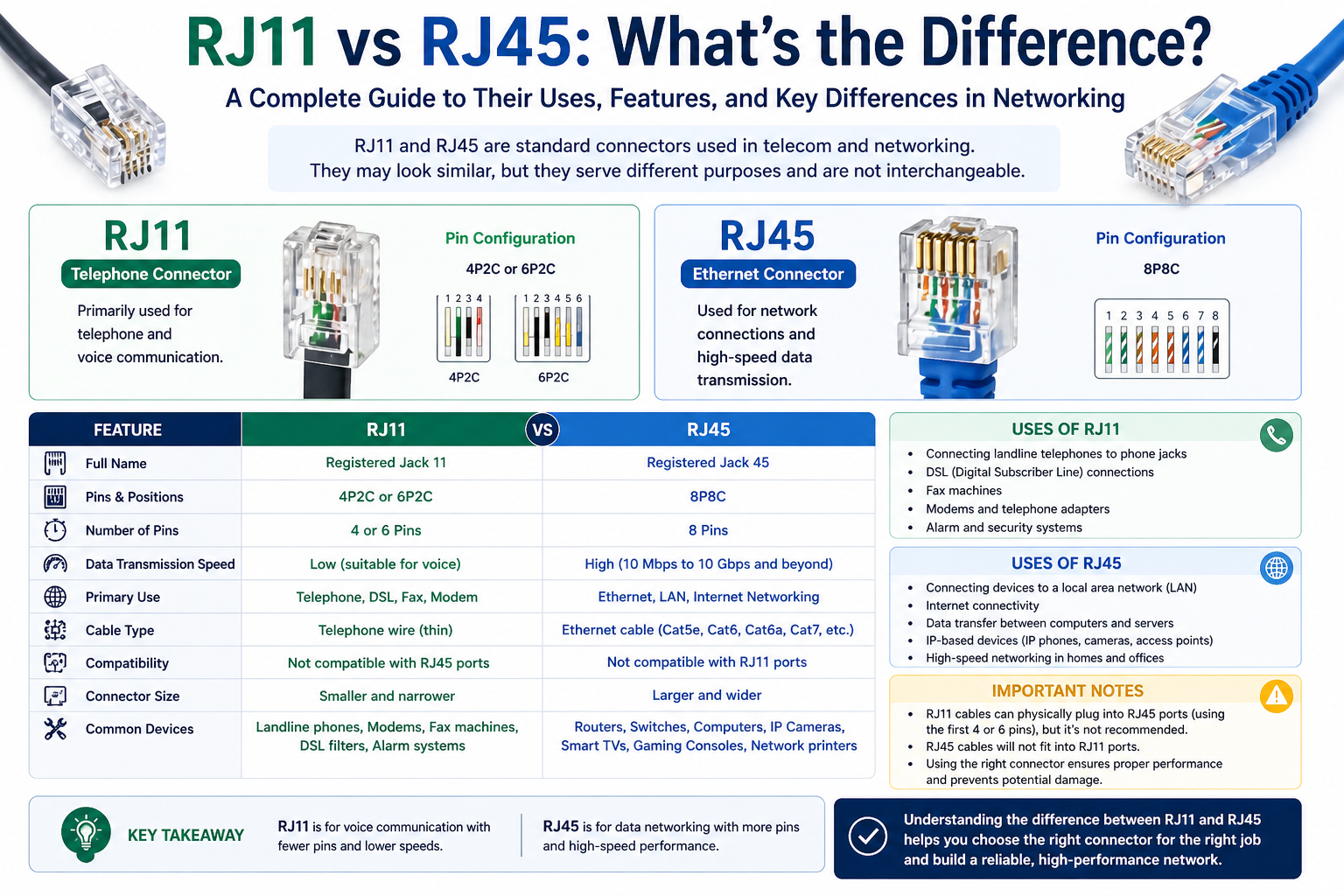 The difference in bandwidth also determines how each connector is used in real-world environments. RJ11 remains limited to voice communication, while RJ45 is essential for all high-speed networking needs.