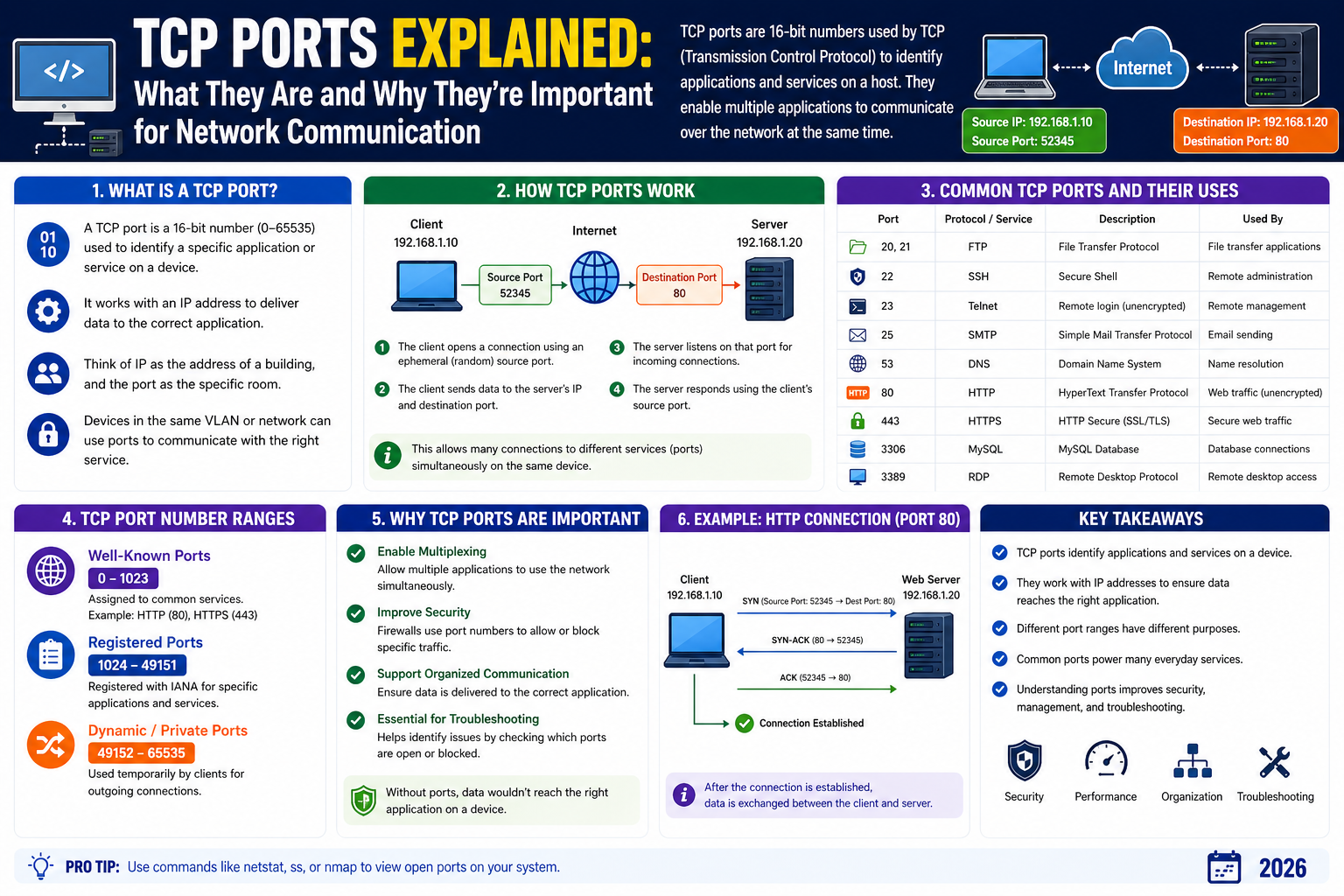 TCP ports are one of the most fundamental building blocks of how devices communicate over networks. While an IP address identifies a device on a network, a TCP port identifies the specific application or service on that device that should receive the incoming data. This dual system ensures that data does not just reach a computer, but reaches the correct program running on it. Without ports, all incoming traffic would be confused, mixed, and unusable because the system would not know where to send each piece of information.