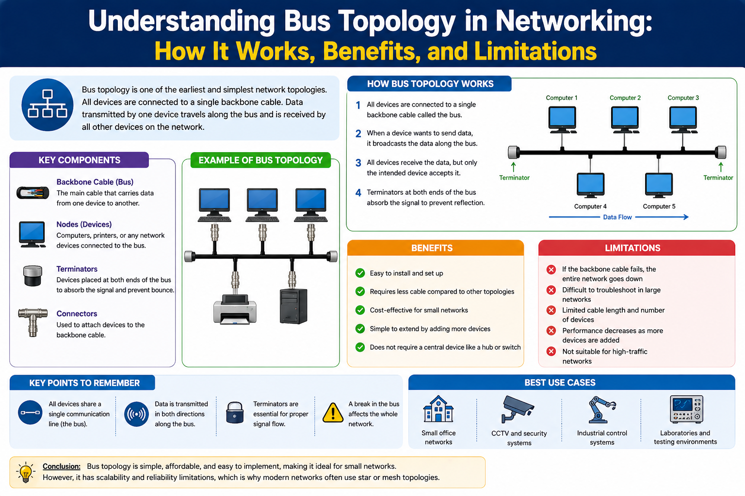 In summary, while bus topology is no longer suitable for large or critical systems, it continues to play a valuable role in foundational learning and in understanding the basic principles of network communication.