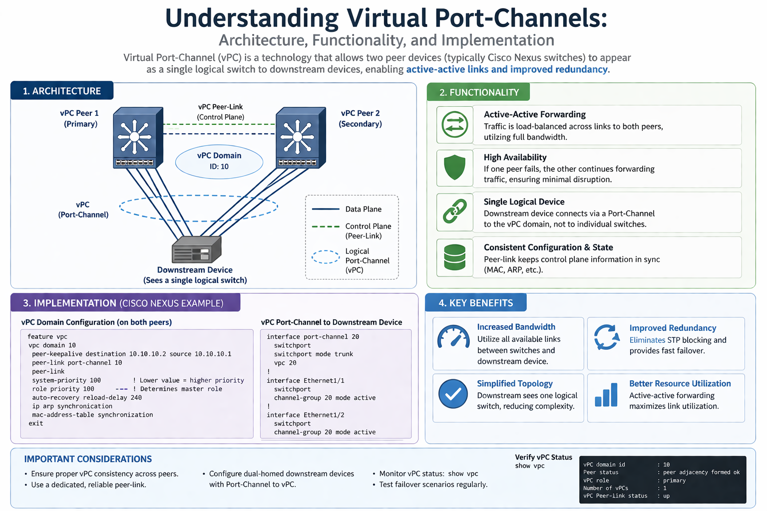 Virtual Port-Channels provide a powerful and reliable approach to building high-availability network infrastructure. By allowing two physical switches to function as one logical system for downstream devices, vPC improves redundancy, bandwidth utilization, and operational flexibility. It removes many of the limitations of traditional Layer 2 designs and reduces dependence on blocked links and slow failover processes.