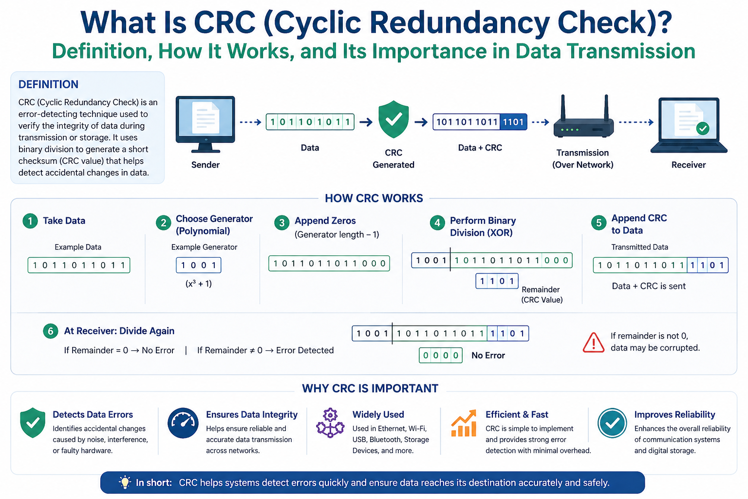 Cyclic Redundancy Check is one of the most reliable and widely used methods for detecting errors in digital communication and storage systems. It helps ensure that data remains accurate when it is transmitted between devices or stored for future use. By using mathematical polynomial division and checksum verification, CRC can quickly identify corruption caused by noise, interference, hardware faults, or transmission failures.