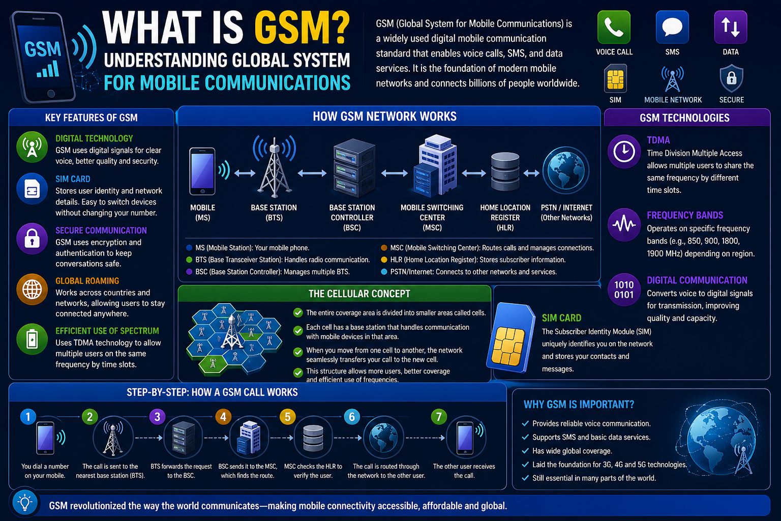 GSM remains one of the most influential technologies in the history of telecommunications. Its introduction standardized mobile communication, improved security, and enabled global connectivity. By using digital signals, SIM-based authentication, and efficient network architecture, GSM transformed how people communicate across the world.