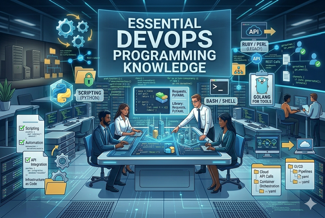 Programming knowledge in DevOps is not about building complex applications from scratch but about enabling automation, integration, and reliability across systems. It combines scripting, system understanding, API interaction, infrastructure logic, and automation design. A strong foundation in these areas allows DevOps engineers to build efficient workflows, maintain stable systems, and respond quickly to operational challenges.