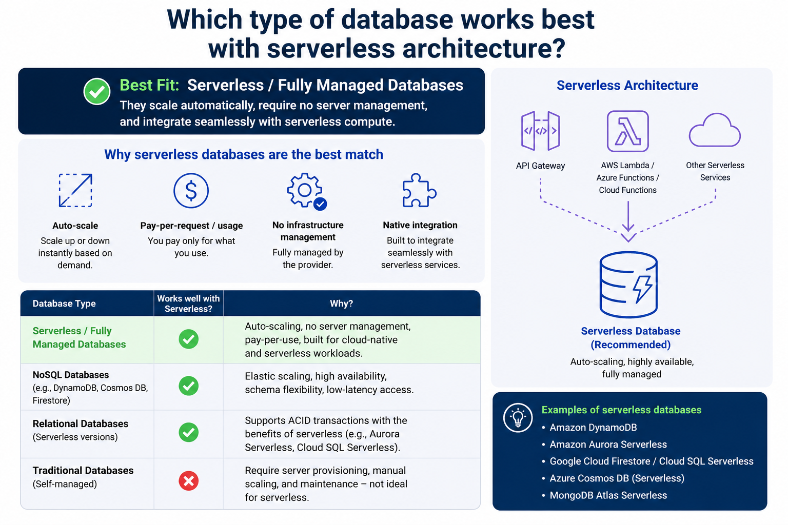 The key difference in serverless environments is that businesses usually prefer managed versions of relational databases instead of self-hosted ones. Managing database servers manually creates operational overhead that goes against the purpose of serverless computing. Fully managed services reduce this burden by handling backups, updates, failover protection, and scaling automatically. This allows development teams to focus on application logic rather than infrastructure maintenance.